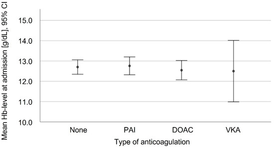 Hb levels at admission depending on anticoagulative medication. PAI: Platelet aggregation inhibitors including acetylsalicylic acid; DOAC: Direct oral anticoagulants; VKA: Vitamin-K-antagonist Warfarin.