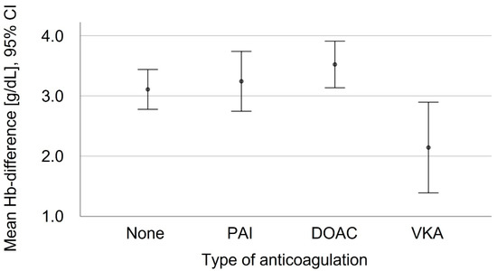 There was no significant difference in the preoperative Hb levels in the patients who did and did not take anticoagulant medication (Figure 4). The postoperative Hb differences among the patients without the need for RBCT (n = 159) were investigated in dependence of their grouped age, AO fracture and dislocation classification, the type of anticoagulation, ASA classification, grouped surgery time and grouped time to surgery. The mean postoperative Hb difference in dependence of the anticoagulation treatment is shown in Table 3 and Figure 5. The logistic regression showed a significantly increased likelihood of higher Hb differences for the patients with higher preoperative Hb levels (p < 0.001), longer operating times (p = 0.001) and who took a DOAC treatment (p = 0.020). Without becoming statistically significant, the patients on VKA tended to a lower Hb difference when they were compared to the non-coagulated patients.