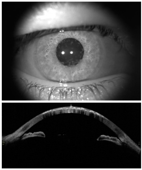 Slit-lamp biomicroscopy (diffuse illumination) (upper image) and anterior segment OCT (AS-OCT) images recorded from a case with GCD in the current study (lower image).