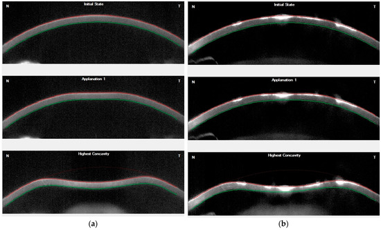 Corvis tomograms in (a) a normal subject; (b) a subject with granular corneal dystrophy (GCD).
