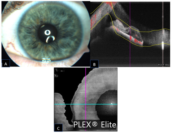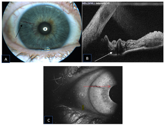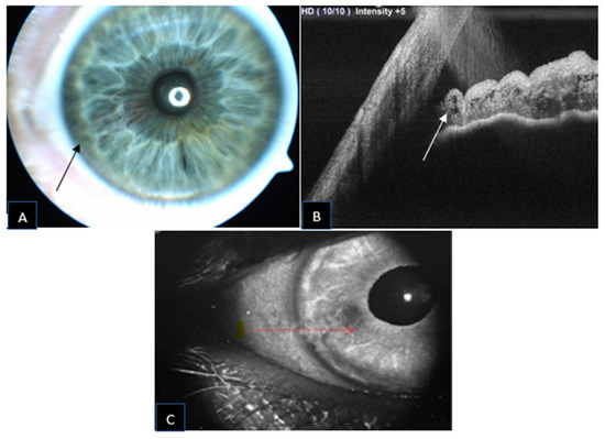 Iris racemose hemangioma appearance on slit lamp photography ((A); black arrow) with a corresponding AS-OCT ((B); white arrow) and infrared photograph ((C); red arrow). The arrows indicate the superior border of the lesion.