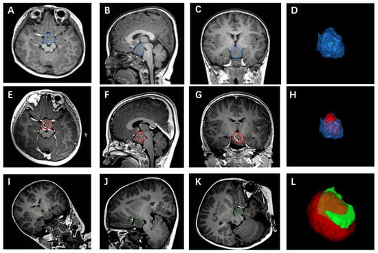 (A–D) The construction of the HH body. (D): The constructed 3D model of HH body. (E–H) The construction of the ablation area. (H): The 3D model of ablation area and HH body. (I–L) The construction of the border between HH and normal brain tissue. (L): The 3D model of the border and ablation area. The circled area was manually outlined to constructed 3D model.