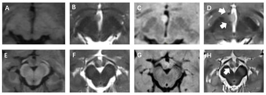 (A,E) T1-MPRAGE. (B,F) 3D-T2WI TSE. (C,G) 3D-T2WI FLAIR. (D,H) T2-STIR. The white arrows in (D) point to the fornix and mammillothalamic tract, respectively. In (H), it points to the mammillary body.