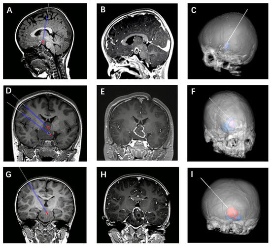 The primary goal of surgical ablation was to disconnect the HH from normal brain tissue via the destruction of the HH basement layer, thereby achieving satisfactory seizure control. Prior studies have reported on the importance of disconnection in HH treatment [,]. During our trajectory planning process, entry point design was separated into two categories: anterior and posterior approaches. The anterior path entailed the use of an entry point in the frontal lobe and was generally considered to be safer than the posterior approach as the resultant trajectory was shorter and crossed fewer important structures. As such, the anterior path was usually the first choice when designing. Posteriorly growing HH lesions in the sagittal plane necessitated the use of a posterior approach employing an entry point generally set at the postcentral gyrus in the parietal lobe in order to achieve sufficient ablation. However, this approach necessitated a longer path and required the crossing of central region, the posterior limb of internal capsule and the thalamus. Computers were used to estimate the maximum ablation range achievable through adjustments to power and time in the surgical planning software, with an estimated range being selected to cover as much of the HH border as possible and to thereby determine an appropriate target point. It is critical that several crucial structures be protected when selecting the target ablation area. Care must be taken to avoid the mammillary body, mammillothalamic tract, and fornix in order to prevent any short- or long-term memory deficits. Our center utilized T2-STIR sequences to differentiate HH lesions from the mammillary body and mammillothalamic tract during ablation planning. Because it has higher contrast between HH and surrounding structures than other sequences (Figure 2). In order to minimize the incidence of endocrine complications, the hypothalamus must be avoided to the greatest extent possible. The optic tract and blood vessels must also be protected to prevent hemorrhage or damage to the visual field. To ensure greater accuracy during catheter implantation, the path should also be perpendicular to the surface of the skull and avoid the ventricle.