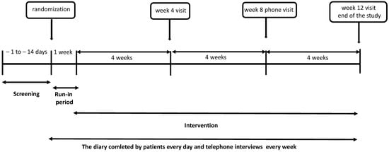 - IBS symptom severity assessment, with the use of IBS-SSS [32]—at visit 0 and at weeks 4, 8, and 12 of the study intervention, and with patient-rated (on a Likert scale) symptom severity from patient diaries—weekly;