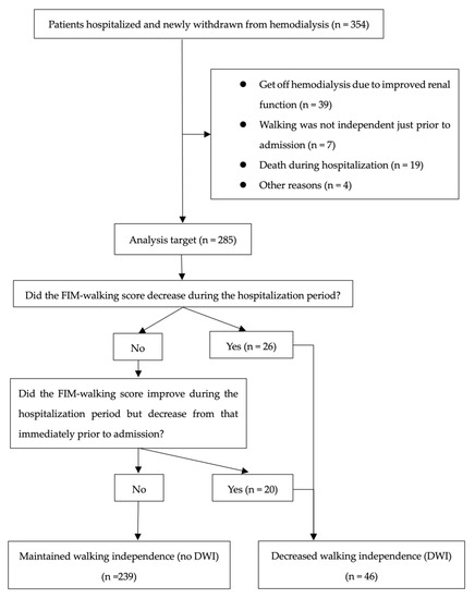 Our study had several limitations. First, some confounders remained unmeasured. Although we attempted to cover the adjustment for confounders related to physical function reported in previous studies, more detailed adjustments need to be considered in future prospective studies. Second, the FIM-walking score assessment was based on medical records, which may be inaccurate for estimating walking independence. To address this issue, two physiotherapists independently conducted the assessment, and we attempted to make it as objective as possible. Third, the GNRI may not accurately reflect the nutritional status of patients. During the induction phase of dialysis, patients may be overweight due to fluid retention, which may lead to an overestimation of the GNRI. However, an accurate nutritional assessment index has not yet been established for the induction phase of dialysis. Therefore, the GNRI, an established index for maintenance dialysis patients, was used in this study. Fourth, 19 of the 69 patients excluded died during hospitalization. The possibility that the exclusion of these 19 cases could be a confounding factor cannot be ruled out. Fifth, our study failed to consider the impact of medical restraints on DWI. Some patients are at risk for dialysis catheter removal due to delirium, insubordination to medical staff, or other reasons. Such patients are subject to medical restraints during hospitalization, which may be one of the risk factors for DWI [44]. However, the hospital has implemented initiatives to eliminate physical restraints, and only six of 285 patients (2.1%) were identified as being physically restrained. Therefore, this study could not clearly examine the impact of physical restraints on DWI.
