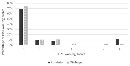 Changes in FIM-walking scores between admission and discharge. On admission, 69% had an FIM-walking score of 7, which increased to 74% at discharge. An FIM-walking score of 1 was present in 12% of patients on admission, but decreased to 2% at discharge.