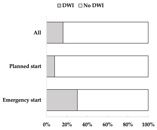 Percentage of decreased walking independence (DWI) in all patients, patients with planned dialysis start, and patients with emergency dialysis start (EDS). The figure shows the percentage of patients with DWI. Walking independence decreased in 16% of all patients, 8% of patients with planned dialysis start, and 30% of patients with EDS.