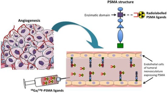 Finally, PSMA expression on the endothelium of tumoral vessels has been detected in many other different tumors, including more common histotypes, such as oral squamous cell carcinomas [104,105] and melanomas [106], and relatively rare neoplasms, such as endolymphatic sac tumors [107].