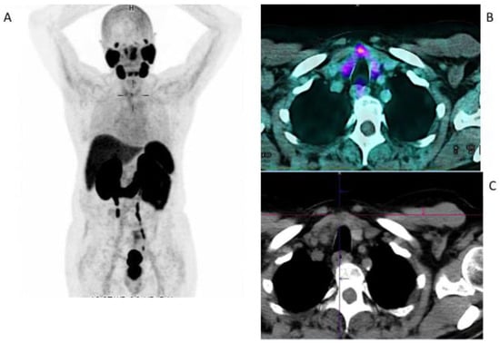 Incidental findings of thyroid cancer in a 63-year-old patient studied with 68Ga-PSMA-11 for prostate cancer. MIP (A) and fused images (B) showing focal uptake (SUVmax 3.5) on the thyroid gland corresponding to a hypo-dense nodule on a co-registered low-dose CT scan (C). The ultrasound fine needle aspiration revealed Thy 4 (suspicious for malignancy) and the patient underwent a total thyroidectomy. The histology revealed a poorly differentiated papillary thyroid carcinoma.