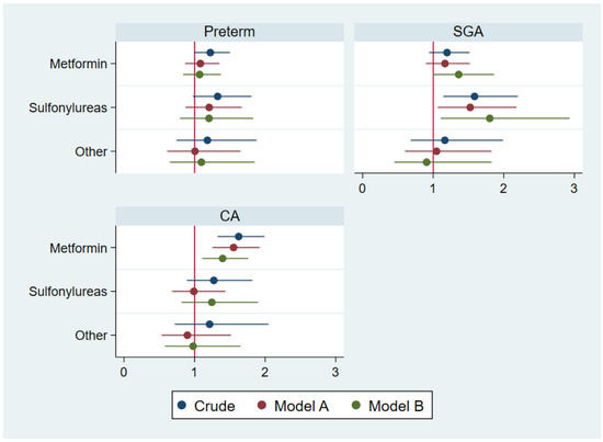 Shows the crude and adjusted ORs for preterm birth and small for gestational age (SGA), and the HRs for congenital abnormalities, according to paternal use of non-insulin anti-hyperglycemic agents (metformin, sulfonylureas, others) prior to conception. In model A, we adjusted for maternal and paternal age, maternal and paternal comorbidity, mother’s use of antidiabetics, parity, sex of the child, calendar year, and other types of non-insulin anti-hyperglycemic agents prior to conception. In model B, we added maternal BMI and maternal smoking.