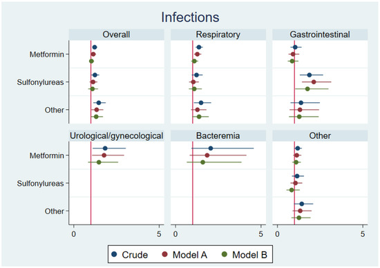 Shows the HRs for overall child infections, and types of infections in the first year of life after paternal use of non-insulin anti-hyperglycemic agents (stratified according to metformin, sulfonylureas, others). In model A, we adjusted for maternal and paternal age, maternal and paternal comorbidity, mother’s use of antidiabetics, parity, sex of the child, calendar year, and other types of non-insulin anti-hyperglycemic agents prior to conception. In model B, we added maternal BMI and maternal smoking.