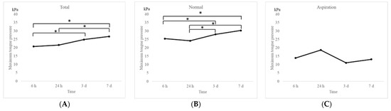 Figure 2B). On the contrary, no significant increase was observed in the aspiration group, which exhibited significantly lower MTP values than those in the normal group (13.9 kPa, 18.7 kPa, 11.1 kPa, and 13.1 kPa at 6 h, 24 h, 3 days, and 7 days after extubation, respectively;