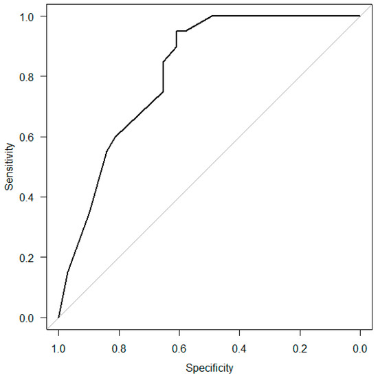 Table 3). “Age above 75” and “Low MTP value (6 h)” were the significant variables; therefore, ROC curve analysis was performed to investigate the predictive ability of the combination of “Age above 75”, “Causative diseases”, “Low MTP value (6 h)”, and “Low MTP value (24 h)” for dysphagia (