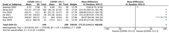 Pooled analysis of KL-6 levels among COVID-19 positive vs. negative patients varied and amounted to 443.37 ± 249.33 vs. 205.73 ± 86.8 U/mL (MD = 275.33; 95%CI: 144.57 to 406.09; p < 0.001; Figure 2).