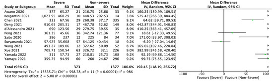 12 studies reported KL-6 levels in severe and non-severe COVID-19 patients. Pooled analysis showed that KL-6 level was 402.82 ± 261.16 U/mL in severe group and was statistically significantly higher than in non-severe group (297.38 ± 90.46 U/mL; MD = 192.45; 95%CI: 118.19 to 266.72; p < 0.001; Figure 3).