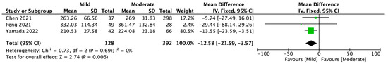 Three studies compere KL-6 marker among mild and moderate COVID-19 patient groups. KL-6 in mild group was 272.28 ± 95.42 U/mL, compared to 268.04 ± 55.04 U/mL in moderate COVID-19 group (MD = −12.58; 95%CI: −21.59 to −3.57; p = 0.006; Figure 4).