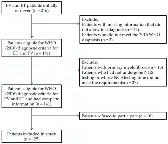 This was a single-center, retrospective study in which we analyzed patients with ET and PV attending the Xiyuan Hospital of China Academy of Chinese Medical Science between January 2018 and March 2022 and reassessed the diagnoses according to the WHO (2016) diagnostic criteria for ET and PV [17], retrospectively recording the baseline clinical and laboratory data. The patient selection process is illustrated in Figure 1. Finally, 125 patients with MPN who met the diagnosis and had complete clinical data were included, including 75 cases of ET and 50 cases of PV. DNA samples for NGS and peripheral blood samples for coagulation testing were obtained from the peripheral blood specimens collected at the time of diagnosis or within 3 months of diagnosis, but not upon treatment. This study was approved by the Ethics Committee of Xiyuan Hospital of China Academy of Chinese Medical Science according to the guidelines presented in the Declaration of Helsinki (2019XLA024-3). All the subjects signed the informed consent form.