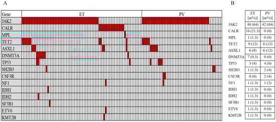 - Delic, S.; Rose, M.; Kern, W.; Nadarajah, N.; Haferlach, C.; Haferlach, T.; Meggendorfer, M. Application of an NGS-based 28-gene panel in myeloproliferative neoplasms reveals distinct mutation patterns in essential thrombocythaemia, primary myelofibrosis and polycythaemia vera. Br. J. Haematol. 2016, 175, 419–426. [Google Scholar] [CrossRef]