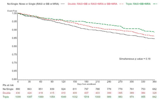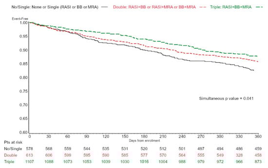 Of note, the potential benefits from a combination of BB, RASI, and MRA among patients with LVEF above 40% is indirectly supported by a recent post-hoc comparison of multiple RCTs [], which considered the theoretical benefit provided by the administration of a triple therapy comprising ARNI, MRA, and SGLT2i. However, ARNIs are not recommended for HFpEF treatment and EMA has not approved them even in patients with HFmrEF. Additionally, SGLT2i drugs have been effective in trials, considering patients already treated with BB and/or RASI (approximately 70–80% of patients), while 30% were on MRA []. Our findings add to this trial evidence, representing the real-world setting, which is often quite different from trial populations. Moreover, RCTs are normally designed to test the effectiveness of a specific drug, while they usually do not formally assess whether a combination of therapies might prove useful. This is an unmet need in HFpEF and HFmrEF, and registry data might indeed help to provide an answer to this important question.