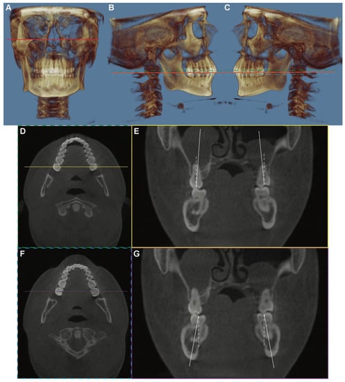The demography of measurement workflow. (A) The CBCT image was oriented such that a line connecting the inferior border of the orbital rims (red line) was parallel to the floor. (B,C) The CBCT image was oriented such that the functional occlusal plane (orange line) was parallel to the floor. The axial sections of the maxillary arch (green dot line) and the mandibular arch (blue dot line) were used for sagittal guideline determination. (D,E) The measurement of the buccolingual inclination of the maxillary second molars. (D) On the axial section of the maxillary arch, the location of the coronal slide was defined as a line (yellow line) that passes through the midpoint of the mesiodistal occlusal crown width of bilateral second molars. (E) The coronal cross section was obtained in a 0.5 mm slice. The long axis of the tooth (solid white line) was defined as a line connecting the midpoint of the buccal and lingual cusp tips and the midpoint of the buccolingual width at the cervical base close to the furcation of the anatomic crown. The angle at which each molar’s long axis intersects a true vertical line (white dot line) was measured and represents the inclination of the tooth. (F,G) The measurement of the buccolingual inclination of the mandibular second molars. The axial section of the mandibular arch was used. The purple line represented the location of the coronal slide, as shown in (G).