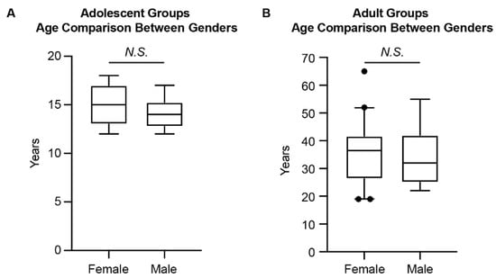 The age comparison between genders for the adolescent and adult groups. (A) The age comparison for the adolescent groups. (B) The age comparison for the adult groups. The Mann–Whitney U test was used. The box plot represents the 5th percentile, 25th percentile, median (50th percentile), 75th percentile, and 95th percentile, respectively. N.S.: not significant.