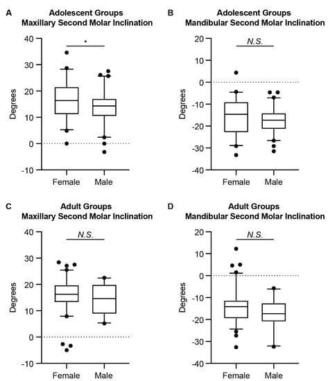 The comparison of the second molar inclination between genders. The (A) maxillary and (B) mandibular second molar inclination of females and males in the adolescent groups. The (C) maxillary and (D) mandibular second molar inclination of females and males in the adolescent groups. The Mann–Whitney U test was used. The box plot represents the 5th percentile, 25th percentile, median (50th percentile), 75th percentile, and 95th percentile, respectively. *: p < 0.05; N.S.: not significant.