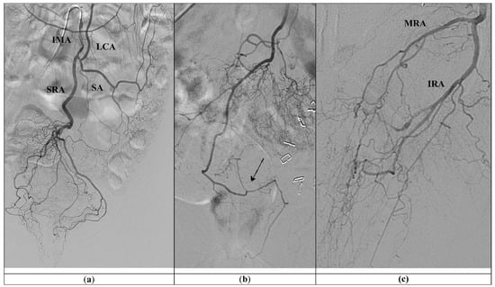 (a) Standard vascular anatomy of IMA: left colic artery (LCA), sigmoid arteries (SA), and type I superior rectal artery (SRA) are visualized after contrast injection. (b) Type II SRA: a right main trunk crosses and gives branches to the left (arrow). (c) Prominent left middle rectal artery (MRA) and inferior rectal artery (IRA) give the main blood supply to the left wall of the distal rectum.