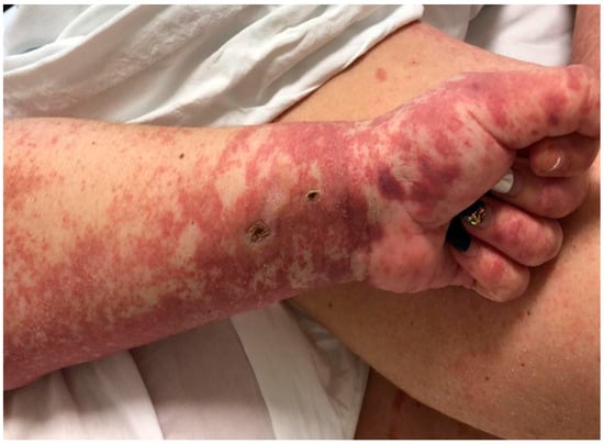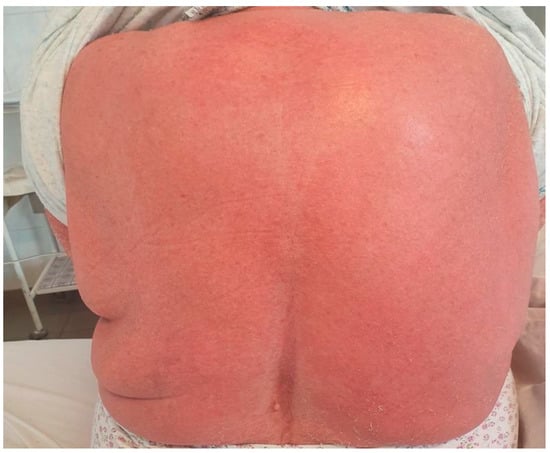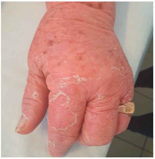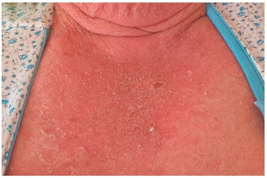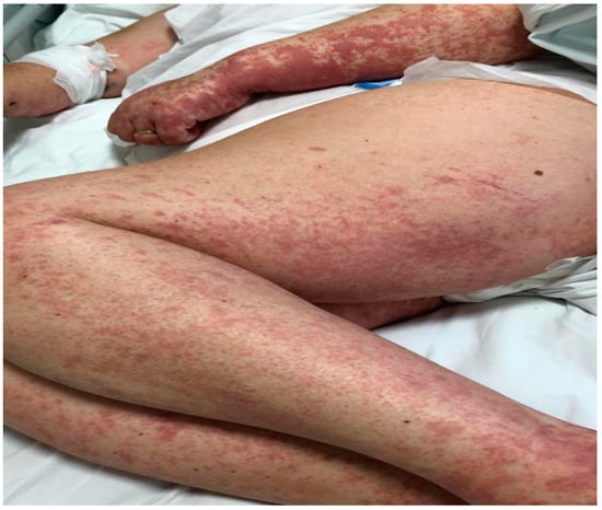 A 78-year-old female patient was admitted to the hospital with a 2-week history of rash and fever. Three weeks before admission, she had taken allopurinol for gout. Prior to her admission, the patient was treated by her family doctor with antihistamines (four tablets/daily) and corticosteroids (40 mg of prednisone equivalent/day for three days, followed by a 5-day taper), without any clinical improvement. At the time of the admission, the patient’s body temperature was 39.2 °C. Physical examination revealed a generalized erythematous skin rash with lamellar desquamation, especially on the arms, thighs, and anterior thorax (Figure 3, Figure 4 and Figure 5), and generalized lymphadenopathy. Peak laboratory values during hospitalization included peripheral eosinophilia of 21.6% (reference range, 1–4) and 2.62# (reference range, 0.05–0.4), altered renal function (blood urea nitrogen test of 183, reference range 18–48, and a serum creatinine level of 1.66, reference range of 0.51–0.95) with consistent normal liver tests. The antinuclear antibody test and urinalysis, as well as chest radiograph, echocardiogram, and ECG, were normal. Viral hepatitis markers (HAV, HBV, and HCV), and testing for mycoplasma and chlamydia, as well as blood cultures, brought negative results.