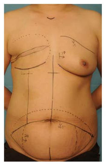 - Elliott, L.F.; Hartrampf, C.R., Jr. Tailoring of the new breast using the transverse abdominal island flap. Plast. Reconstr. Surg. 1983, 72, 887–893. [Google Scholar] [CrossRef]