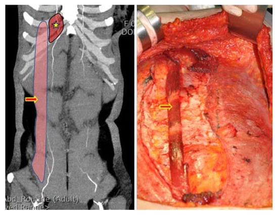 A rectus abdominis muscle inserted into the costal cartilage of the fifth, sixth and seventh ribs was resected with sufficient width and length as to receive the flipped muscle pedicles for transposition. Muscle resection must be limited to just above and lateral to the costal margin to ensure muscle preservation and to avoid injury to the superior epigastric artery located deep inside and along the costal margin. After muscle resection, any bleeding points should be thoroughly cauterized, as there are usually 1–2 perforators in this area. The bottom of this tunnel consists of the ribs and cartilage; the medial limit was the xyphoid, and the lateral limit was the preserved muscle. The pTRAM pedicle was placed in the widened tunnel formed by muscle removal at the bottom (Figure 5 and Figure 6). After the pTRAM flap had been completely transferred, it was easy to see the deep superior epigastric artery (DSEA) enter the muscle. Further cutting of the rectus muscle to prevent the pTRAM pedicle from being compressed in the tunnel ensured improvement of blood circulation (Supplementary Video S1: pTRAMtechnique.MP4).