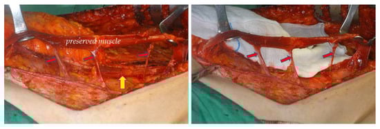Preserved rectus muscle with innervated intercostal nerve (red arrows). The yellow arrow indicates the rectus muscle that is used as the pedicle, and the muscle held by the Army-Navy retractor is the preserved rectus muscle.