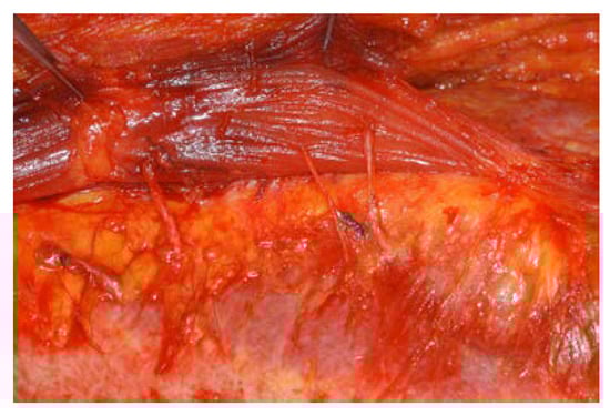 Neurotization of the cut intercostal nerves. Under the microscope, the end of the cut nerve was inserted between the rectus muscle fibers that were open, and the epineurium of the nerve and the epimysium of the muscle were sutured.