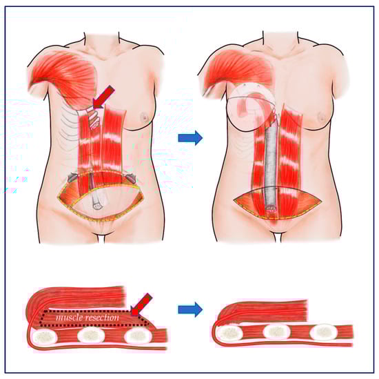 2.2.3. Partial Removal of Rectus Abdominis Muscle Inserting into Ribs and Flap Insetting