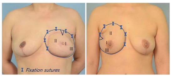 According to the current results, the frequencies of fat necrosis are both somewhat high at 36.1% in the classical pTRAM group and 32.1% in the PMR pTRAM group, and partial flap necrosis is present, but most cases are mild and can easily be corrected under local anesthesia immediately after the necrotic area is established or during a secondary touch-up procedure. The higher fat necrosis rate in our patients with delayed reconstruction vs. immediate reconstruction may be due to the inability to completely excise zone 2, in which the blood supply is poor because a large amount of skin and soft tissue is needed for delayed breast reconstruction. Even in immediate breast reconstruction patients, fat necrosis occurred mostly in zones 2 and 4. Accordingly, the authors posit that the increase in fat necrosis was caused by the insufficient resection of zone 2. Therefore, the most reliable way to reduce fat necrosis in pTRAM may be to completely remove areas with poor blood supply in advance. In the report of Yoon et al.’s island-type pTRAM breast reconstruction, the rate of fat necrosis was very low (9%) because half of zone 2 was removed []. The use of angiography with indocyanine green fluorescent dye may help to reliably determine the degree of perfusion []. In order to fully utilize the advantages of pTRAM and minimize fat necrosis, the surgeon should aim to completely remove the area in which perfusion decreases in zone 2. Therefore, pTRAM is the most suitable option for patients with small to moderate size breasts (less than a large B cup) and no midline vertical scars in immediate reconstruction.