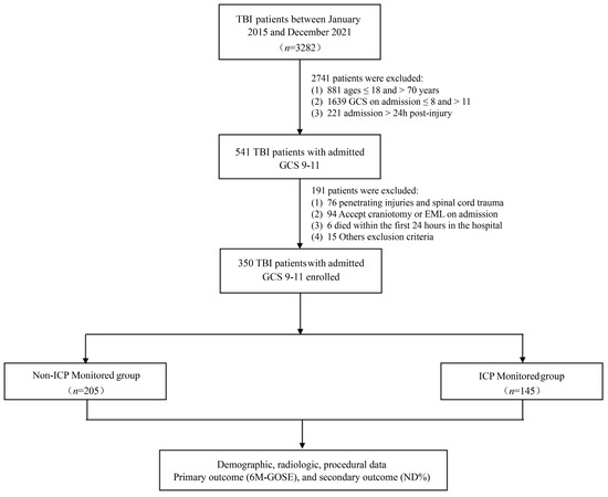 APA StyleChen, M., Wu, H., Li, Z., Ge, S., Zhao, L., Zhang, X., & Qu, Y. (2022). Intracranial-Pressure-Monitoring-Assisted Management Associated with Favorable Outcomes in Moderate Traumatic Brain Injury Patients with a GCS of 9–11. Journal of Clinical Medicine, 11(22), 6661. https://doi.org/10.3390/jcm11226661