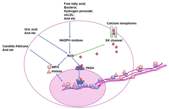 - Douda, D.N.; Khan, M.A.; Grasemann, H.; Palaniyar, N. SK3 channel and mitochondrial ROS mediate NADPH oxidase-independent NETosis induced by calcium influx. Proc. Natl. Acad. Sci. USA 2015, 112, 2817–2822. [Google Scholar] [CrossRef]