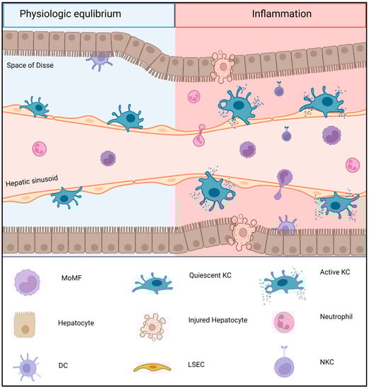 Schematic overview of Kupffer cell (KC) activation states. During the physiologic equilibrium, KCs remain quiescent and self-maintaining, located next to liver sinusoidal endothelial cells in the space of Dissè, which separates hepatocytes from sinusoidal endothelium. In the absence of inflammatory stimuli, only a small number of monocyte-derived macrophages (MoMFs) are recruited from the hepatic sinusoids. Following an inflammatory stimulus (e.g., ischemia reperfusion injury), a cascade of proinflammatory stimuli and damaged hepatocytes lead to an increasing macrophage activation, large numbers of MoMFs, and neutrophils invading the hepatic tissue. The interaction of dendritic cells, natural killer cells, neutrophils, and KCs aggravate inflammation and tissue damage. (Created with BioRender.com, accessed on 24 September 2022).