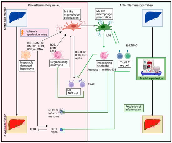 Jassem et al. [] used gene expression analysis in pre- and post-reperfusion biopsies to demonstrate NMP-elicited IRI mitigation. Mechanisms behind IRI mitigation during NMP were mainly identified as the downregulation of pro-inflammatory cytokines, which leads to fewer CD4- and CD8-positive effector T cells, while anti-inflammatory regulatory T-cell (Treg) subpopulations maintained or even increased their number []. Interestingly, the group highlighted that INF gamma affects T cells, while it is known to classically stimulate M1 macrophage polarization. Additionally, the group found decreased neutrophils in hepatic grafts after NMP, which contributes to anti-inflammatory conditions. Other studies have concordantly shown decreased pro-inflammatory cytokines such as TNF-alpha, IL6, and IL1 after NMP in an animal model []. TNF-alpha has long been known as the central mediator of hepatic injury. Among others, it is released by KCs, which have been identified as being a mass producer of TNF-alpha. A decrease in TNF-alpha ameliorates oxidative stress, KCs, and neutrophil activation. ROS itself is a major stimulus for the release of HMGB-1, which binds to TLR4 on KCs and DCs, leading to the production of IL6, TNF-alpha, and ICAM1 [].