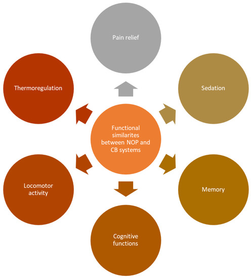 The potential synergistic effects of cannabinoids and classical opioids was tested repeatedly and the results stated that the administration of various cannabinoids with morphine produces a synergistic effect as measured when applying the tail flick test in mice [61] and in rhesus monkeys when measured via warm water test withdrawal [62]. The effect of the co-administration of cannabinoids and morphine on nociceptive behavior in a rat model of persistent pain was studied in the thalamus, and the intraparietal pre-administration of Δ-9-THC (1 or 2.5 mg/kg), cannabidiol (5 mg/kg), morphine (2 mg/kg), Δ-9-THC + morphine, Δ-9-THC + cannabidiol or vehicle was evaluated in the formalin-evoked nociceptive behavior test. The results showed that, when administrated selectively, both Δ-9-THC and morphine reduced both phases of formalin-evoked nociceptive behavior, while cannabidiol alone had no effect. The intraparietal co-administration of Δ 9-THC and morphine reduced the second phase of formalin-evoked nociceptive behavior in rats more significantly than either drug alone [63]. However, despite a significant synergistic effect, data concerning cannabinoids (administrated alone or combined with opioids) as a potential solution to alleviate opioid withdrawal syndrome or the development of tolerance are contradictory and inconsistent [62,64,65]. As was mentioned above, an action of both CB and NOP receptors is associated with pain relief, sedation, memory, cognitive functions, locomotor activity and thermoregulation [61,66]. Therefore, potential crosstalk between two systems could create a basis for the enhancement of either NOP receptors/nociceptin or ECS effects in various areas.