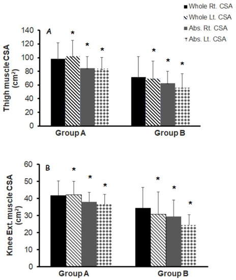 Figure 1 demonstrated the difference in absolute muscle CSA of the whole thigh and knee extensor muscles between group A and group B. Group A had a greater whole thigh muscle CSA in the right (98 ± 24 vs. 71 ± 30 cm2; 27%; p = 0.08) and left (102 ± 23 vs. 69.5 ± 26 cm2; 32%; p = 0.02) legs compared to group B. DXA-leg lean mass was greater in group A (right:13%, p = 0.19 and left: 15%; p = 0.12) compared to group B but did not attain statistical significance.