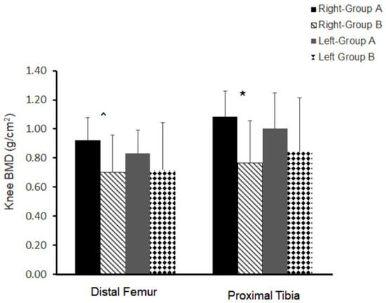 Right knee distal femur BMD (Figure 2) showed a trend (p = 0.08) between both groups (A: 0.92 ± 0.16 vs. B: 0.70 ± 0.16 g/cm2; 24%). Right proximal tibia (Figure 2) was statistically different (p = 0.03) between both groups (A: 1.1 ± 0.18 vs. B: 0.76 ± 0.29 g/cm2; 29%). The left side, although was still greater in group A compared to group B, did not attain statistical significance for the distal femur BMD (p = 0.46; 33%) or proximal tibia BMD (37%; p = 0.39).
