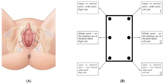 Delimitation of the VPP, a rectangular vaginal strip (about 6–8 cm × 4 cm), on the anterior colpocele. The upper edge of the strip is placed 2 cm from the urethral orifice. Twenty cc of the infiltration mix are injected following the edges of the rectangular vaginal strip and 20 cc in the paravesical space on both sides. The vaginal plastron is then incised and the paravesical spaces are bilaterally dissected up to the ischial spine. The SSL running from the ischial spine to the sacral bone is palpated and identified. One suture is placed through the SSL and after the first passage, the same wire is replaced and a second passage through the SSL is performed with a suture-capturing device that allows sutures to be placed easily without eye-control. Two stitches are placed to the ATFP: a lateral stitch on the tendonal ATFP halfway between the pubis and the sciatic spine and an anterior stitch on the lower edge of pubo-ischial branches. The same procedure is performed on the other side (Figure 1A,B). The sutures used are non-absorbable, polypropylene monofilaments. The vaginal flap is desepidermised in order to prevent the risk of postoperative mucocele, especially in premenopausal women. The VPP will be tied to the SSL and the ATFP by the 3 lateral stitches (upper site for the SSL suture, middle and inferior sites for the 2 arcus tendineus sutures for each side) placed on each side of the VPP. Before the suspension of the VPP, the vaginal closure begins. The VPP is suspended and the vagina is completely sutured.