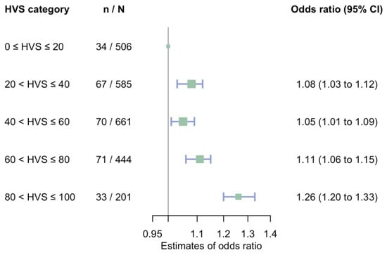 Compared with people with HVS ≤ 20%, those with HVS above 20% face increased odds of annual eGFR slope ≤ −5 mL/min/1.73 m2/year (Figure 1 and Figure 2). In people with HVS above 80%, the adjusted OR were 1.26 (95% CI, 1.20 to 1.33, reference, HVS between 0% to 20%) (Figure 2). Figure S4 depicted each subject’s baseline eGFR and mean annual eGFR change from baseline to end of follow-up, stratified by HVS categories. Subgroup analyses identified a potential subgroup effect that people with HVS between 20% and 40% and between 60% and 80% are at a higher risk of a rapid eGFR decline only among those who ever used insulin (Figure S5). Nevertheless, the subgroup effects are not consistent in other HVS categories.