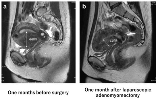 Magnetic resonance imaging (MRI) of pre- and post-laparoscopic adenomyomectomy. (a) photograph of sagittal T2-weighted pelvic MRI 1 month before surgery. The image shows substantial adenomyosis in the anterior myometrium (44 mm); (b) photograph of sagittal T2-weighted pelvic MRI 1 month after laparoscopic adenomyomectomy. The image shows no residual adenomyosis and a decrease in the thickness of the myometrium (25 mm).