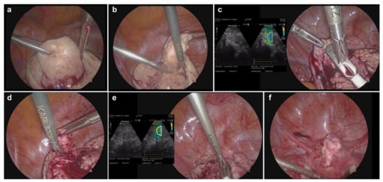 - Ota, Y.; Ota, K.; Takahashi, T.; Suzuki, S.; Sano, R.; Shiota, M. New surgical technique of laparoscopic resection of adenomyosis under real-time intraoperative ultrasound elastography guidance: A case report. Heliyon 2020, 6, e04628. [Google Scholar] [CrossRef]