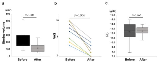 (a) Graph of the uterine volumes before and after laparoscopic adenomyomectomy; (b) graph of the visual analog scale (VAS) scores before and after laparoscopic adenomyomectomy; (c) graph of the hemoglobin levels before and after laparoscopic adenomyomectomy.