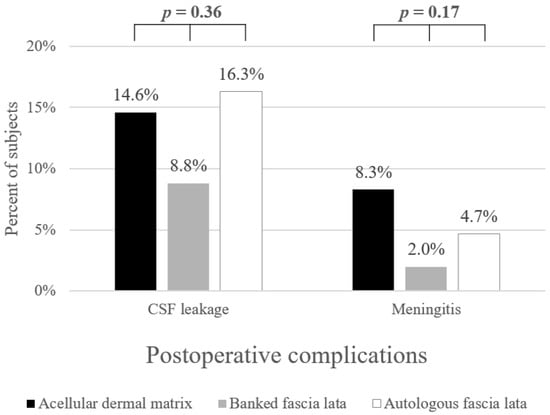 Among the 193 patients, postoperative CSF leak occurred in 23 (11.9%) patients, and 8 (4.1%) developed postoperative meningitis (Table 1). Postoperative CSF leak occurred on mean 12.8 ± 7.9 days after surgery, and there was 1 CSF leak that developed after 1 month postoperatively (range 3–37 days). In 91.3% of cases with postoperative CSF leak, endoscopic repair was required, and the remaining 2 patients required treatment with lumbar drainage and absolute bed rest (1 patient each in ADM and autologous fascia lata group). Postoperative meningitis occurred on mean 12.1 ± 4.9 days postoperatively (range 4–17 days). There were no significant differences in the relevant variables, such as age (p = 0.95), sex (p = 0.33), BMI (p = 0.10), tumor size (p = 0.42), time taken for surgery (p = 0.63), previous radiation (p = 0.31) or previous gamma knife (p = 1.00) history, revision cases (p = 0.15), and diaphragmatic/dural defect location (p = 0.52) among the three groups (Table 2). As a surgical outcome, no significant difference in the occurrence of postoperative CSF leak (p = 0.36) or meningitis (p = 0.17) was observed among the three groups (Figure 1).
