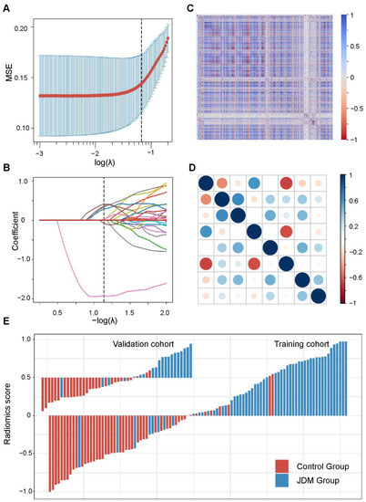 Among 1777 radiomics features extracted from each medical imaging of patients, 813 features showed significant differences between the JDM and control group by univariate analysis. After Spearman correlation analysis (Figure 2C), 54 features were screened out. By the LASSO algorithm conducted to choose the optimized features, eight features with nonzero coefficients were finally selected (Figure 2A,B), and the radiomics score was developed (Figure 2E). The correlation of selected features is shown in Figure 2D.
