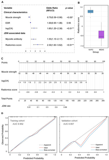 The analysis of relevant characteristics and the construction of a radiomics nomogram. (A) Odds ratio (OR) calculated by logistic regression analysis for the independent risk factors based on the training cohort. (B) The difference in radiomics score of diverse positive myositis antibody. (C) The nomogram combined associated clinical factors and radiomics score to estimate the risk of having JDM. (D) The bootstrapped estimates of calibration accuracy for the nomogram at the training and validation cohorts. * p < 0.05, ** p < 0.01 in conditional logistic regression models.